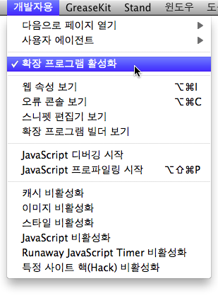 Safari 5.0 부터 확장 프로그램(Extention)이 기능으로 추가되었다. 개발자용 메뉴에서 확장 프로그램 활성화 기능을 켜주면 사용할 수 있다.